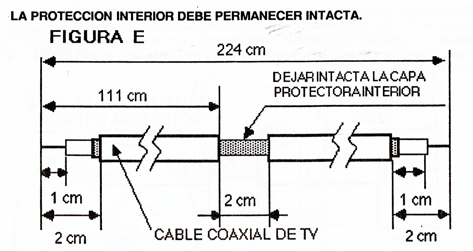 5. Ahora se realiza el aro exterior de la antena. Tome el cable coaxial de TV y corte un trozo de 224 cms. Quítele en cada extremo 2 cms. de la capa aislante exterior al igual que la malla de cobre y corte luego 1 cm. de la parte aislante interior, según se ilustra en la figura E. Finalmente se retira en la mitad del trozo de cable la capa aislante exterior en una extensión de 2 cms.
